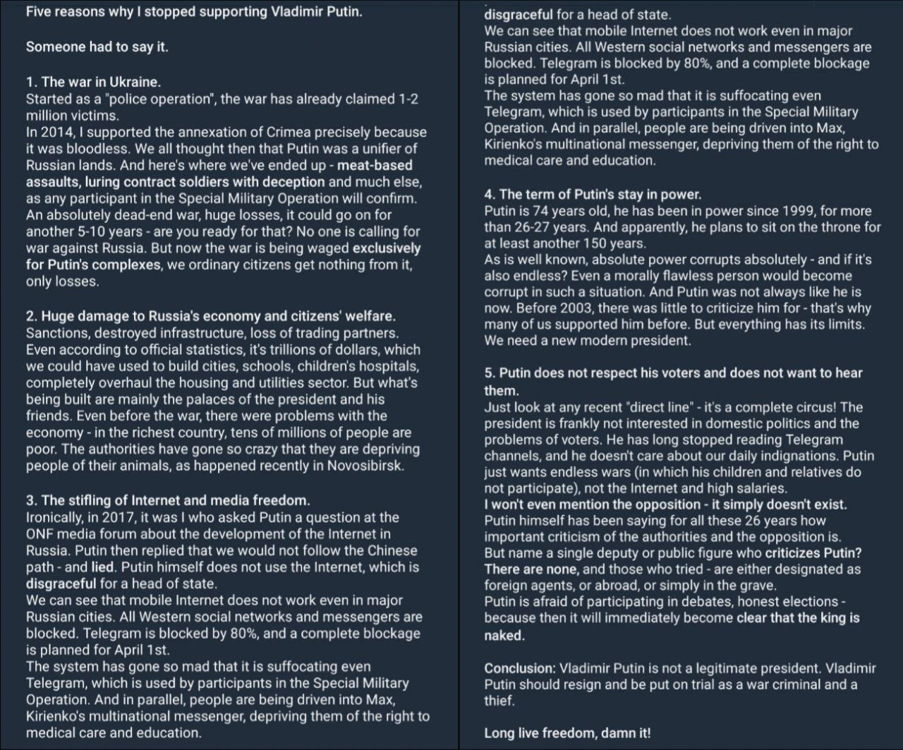 Il a également remis en question l'emprise de Poutine sur le pouvoir, qui dure depuis des décennies , écrivant que le président « ne respecte pas ses électeurs » et suggérant que « le pouvoir absolu corrompt absolument – surtout lorsqu'il est sans fin ». Dans un passage encore plus frappant, Remeslo a déclaré que Poutine n'était « pas un président légitime » et qu'il devrait démissionner et être jugé comme « criminel de guerre et voleur ».
